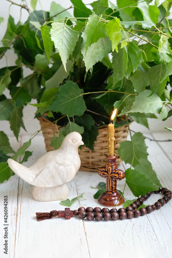 Dove figurine, church candle, rosary beads and birch leaves on wooden table. Dove - symbol of Holy Spirit. Holy Trinity Sunday. festive traditional composition for Pentecost day