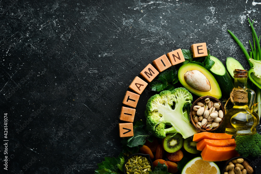 Foods rich in vitamin E: pumpkin, broccoli, dried apricots, parsley, avocado and vegetables. The inscription "Vitamin E". Top view.