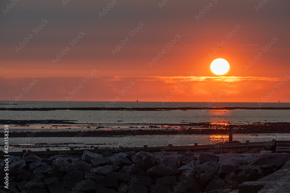 Sunset at the Atlantic coast in Brittany, France, during low tide