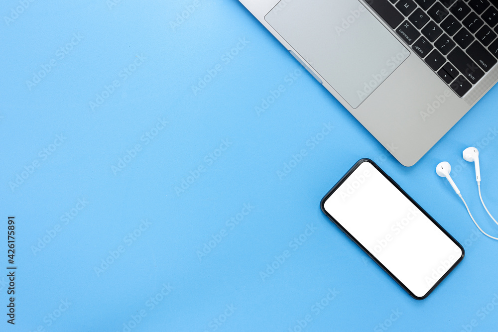 Top view workspace laptop, smartphone, and Headphones with copy space isolated on blue background