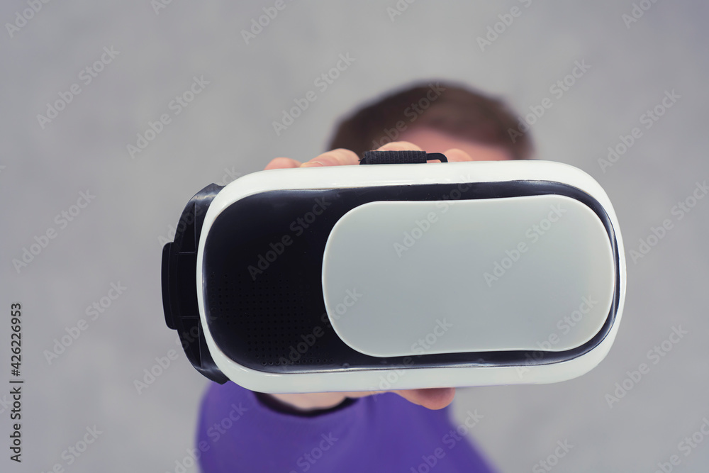Man holds in his hands glasses for virtual reality and 360-degree video. VR helmet for the smartphone on a light background.