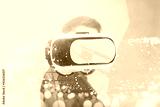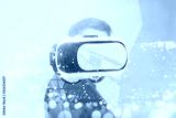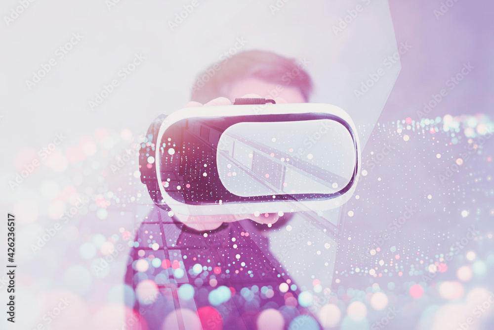 Man holds in his hands glasses for virtual reality and 360-degree video. VR helmet for the smartphone on a technological bright and colored background with blur.