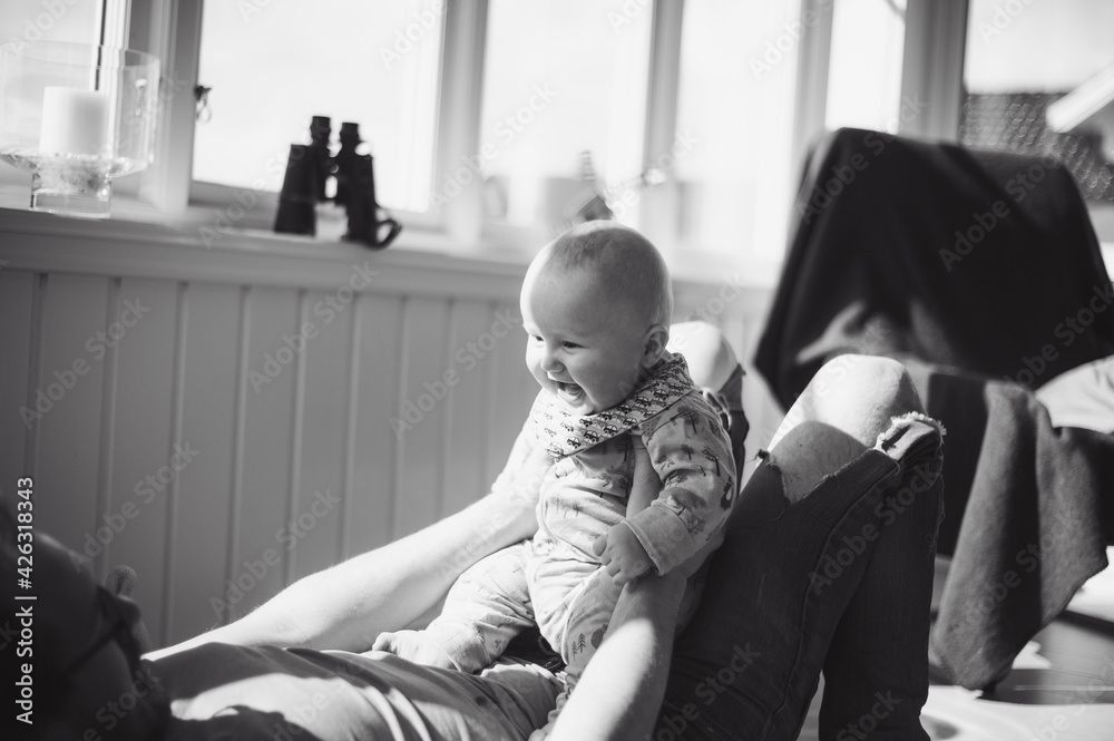 portrait of attractive nerd with glasses at home playing with a son. Cute baby boy. Happy fatherhood