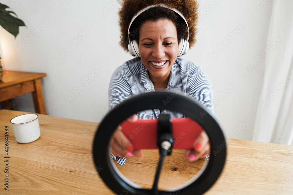 African senior woman streaming online with mobile phone camera indoors at home - Influencer lifestyle concept - Focus on face