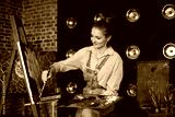 Young beautiful female artist painting still life with sunflower on canvas using oil paintings and art brush. Painter creating artwork in art studio. Relaxation, leisure, hobby, stress management