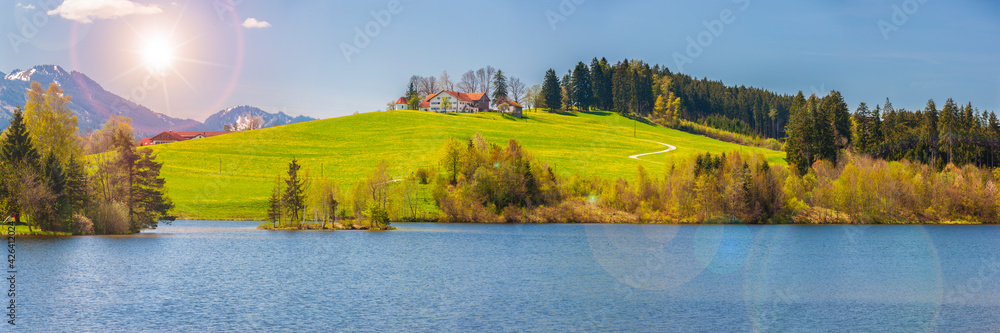 beautiful rural landscape in Bavaria with mountain range and meadow at springtime