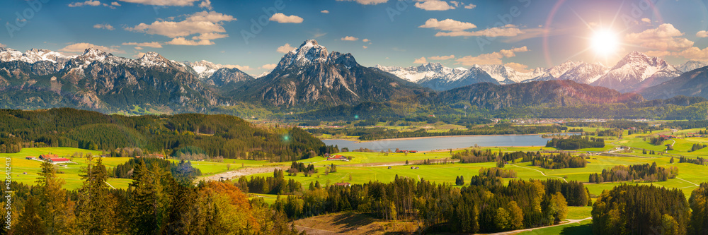 beautiful rural landscape in Bavaria with mountain range and meadow at springtime