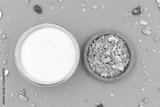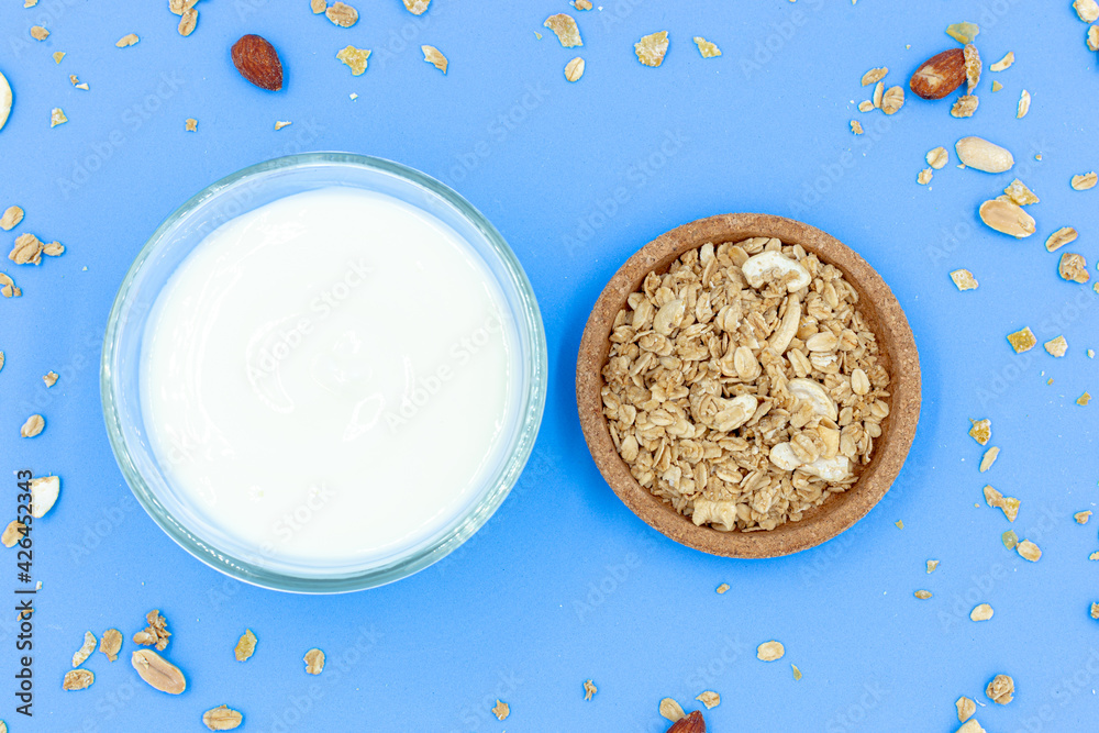 Top view granola healthy with yogurt , cereal bar with nuts and berries isolated on blue background