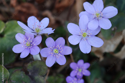 Anemone hepatica purple flowers in to the forest on springtime. Hepatica nobilis in bloom