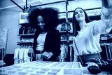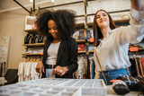 Two friends in dresses and jewelry shop look and choose clothes to buy - Sales assistant helps a customer in the choice in the store - Concept of saleswoman and time for yourself