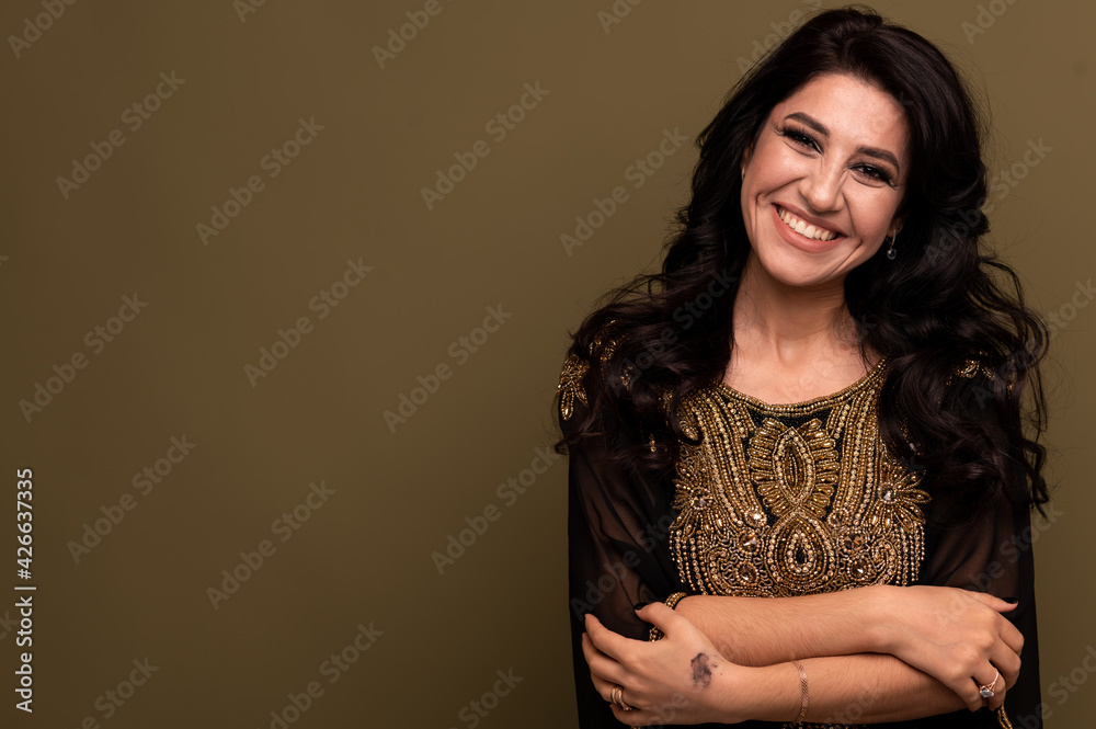 Portrait of beautiful smiling young muslim arabian woman looking at camera, copy space