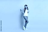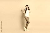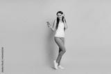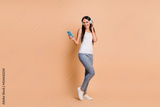 Full length photo portrait of woman in headphones dancing holding phone in one hand isolated on pastel beige colored background