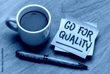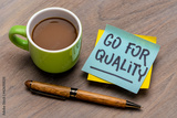 go for quality reminder note with a cup of coffee and pen, business, lifestyle and personal development concept