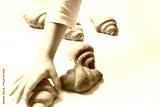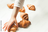 Fresh croissants on the white background. Little girls hand reaching out homemade pastry