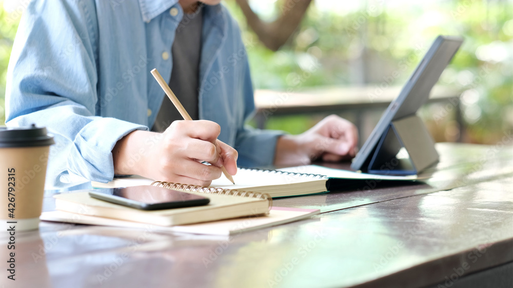 Study online class, Student man hand writing on notebook while learning online course, Education and technology, Work from home