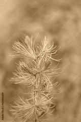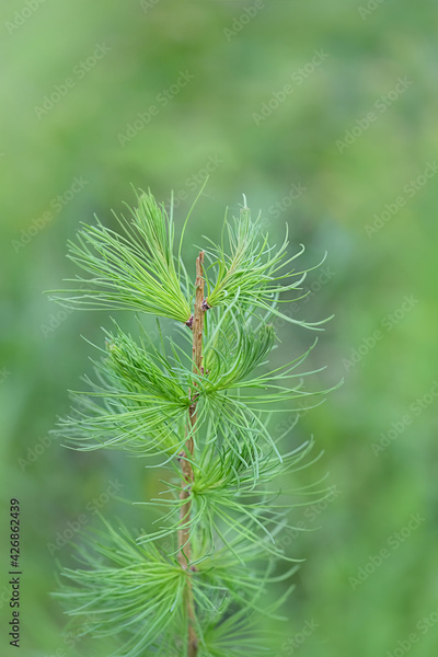 Young green branch of larch Close up. spring growing season. fresh fluffy larch with young needles macro.