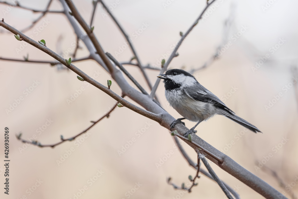 Close up shot of Black capped Chickadee on a tree branch