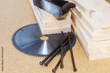 Wooden pine boards . Space for the text. A saw and an old plane.