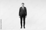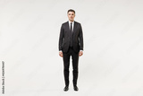 Full length young happy caucasian successful employee business corporate lawyer man 20s wearing classic formal black grey suit shirt tie work in office isolated on white background studio portrait