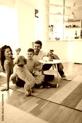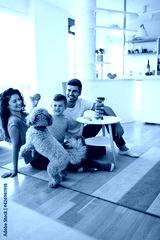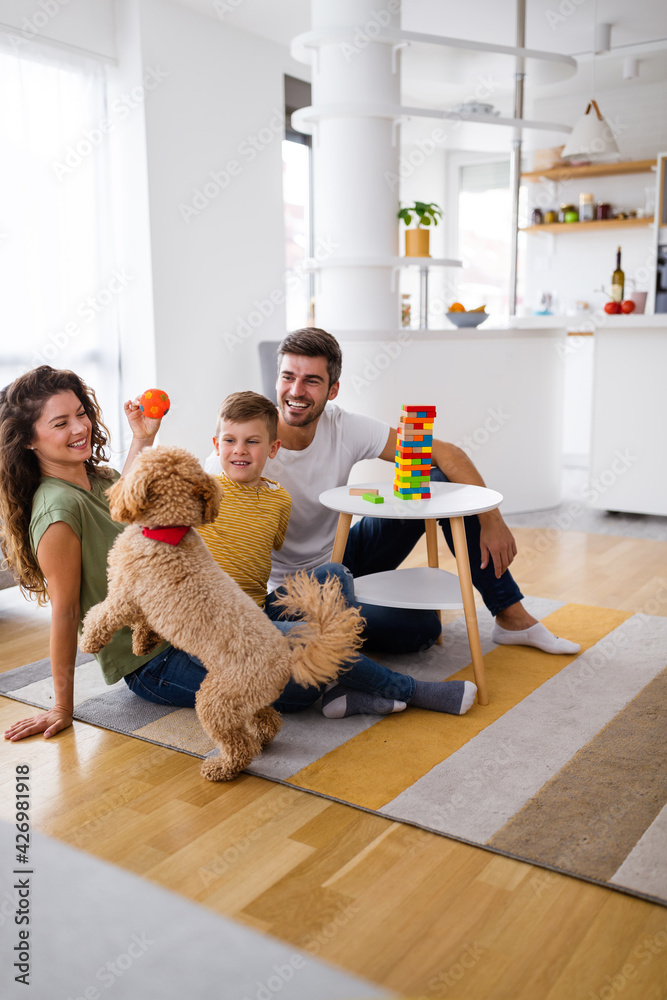 Happy family having fun time, playing together at home with dog