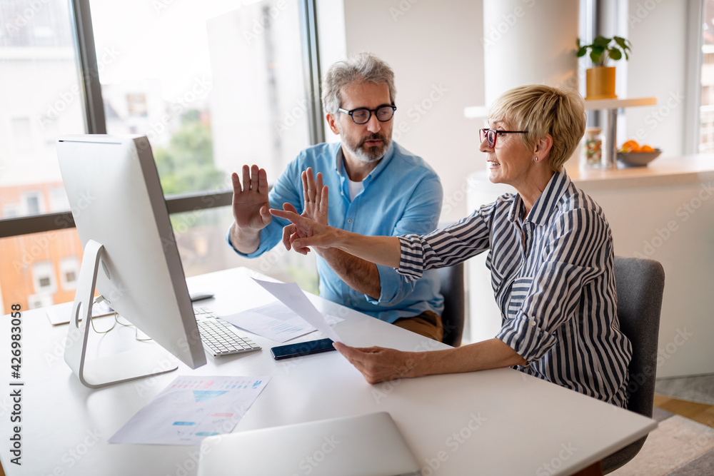 Happy mature business colleagues in modern office using computer and brainstorming.
