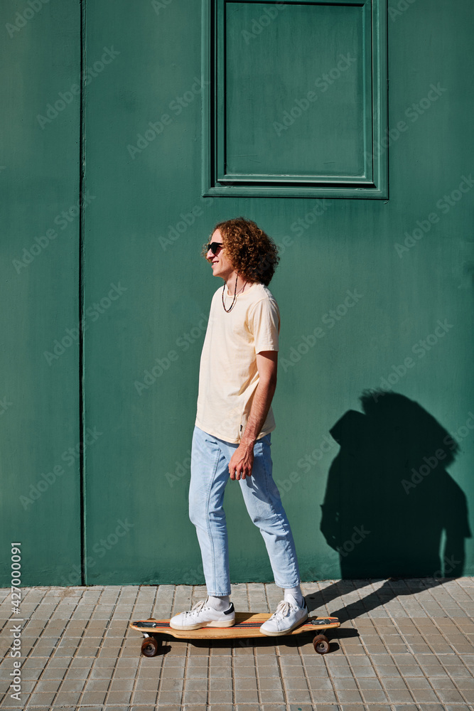 a young man with curly hair and sunglasses with a green wall behind him on a sunny day