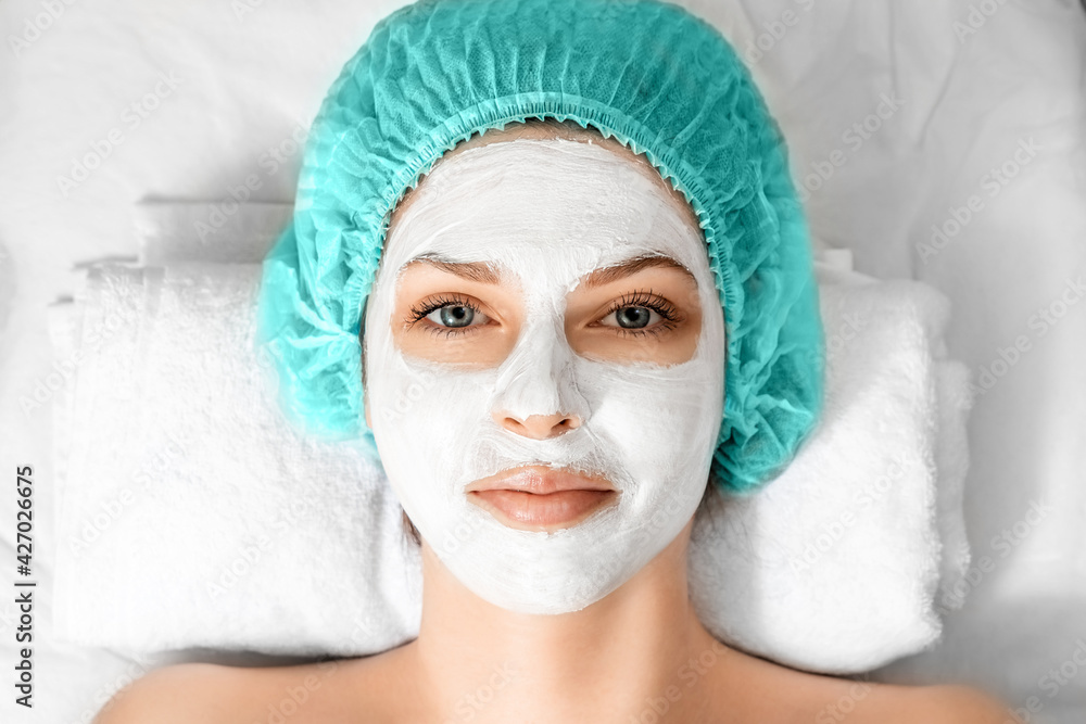 The girl's face covered with a cosmetic mask, close-up. Skin care, beautician, spa treatments, facial hygiene.