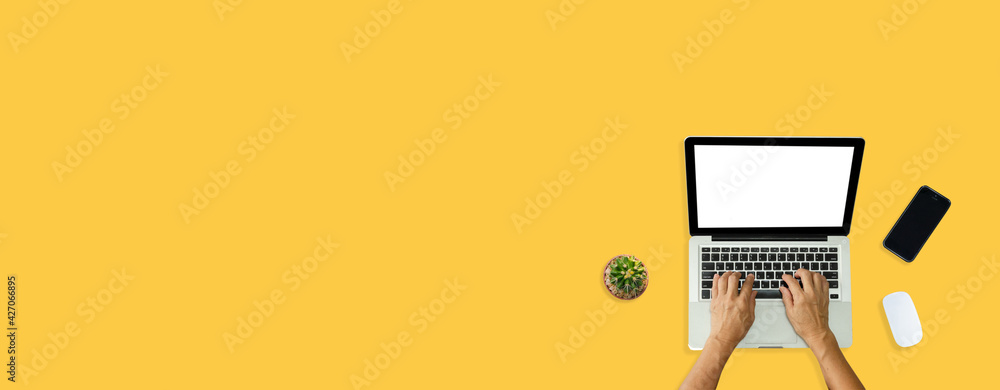 Hand using computer laptop and mouse, phone from above on yellow background.