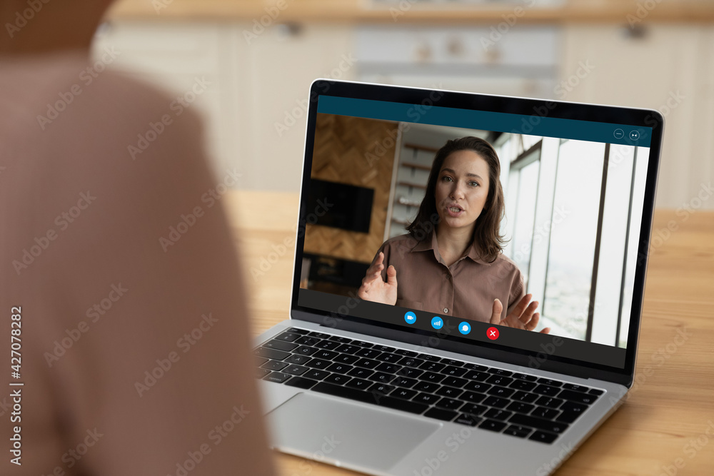 Webcam portrait of young female applicant talk answer employer question on distant job interview. Over shoulder view of client watch webinar training on laptop online listen to woman coach explanation