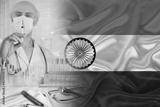 india national flag on silk, doctor with syringe, country population vaccination concept, medical development, fight against covid-19 coronavirus