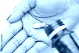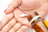 Macro Close up of medicinal or herbal color tablet, capsule and pill are coming out from amber glass bottle on a female hand palm. Top view,