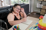 young girl with autism on wheelchair is writing and practicing fun playing with toys at home with his mother. Autistic young students are learning with teachers happily.