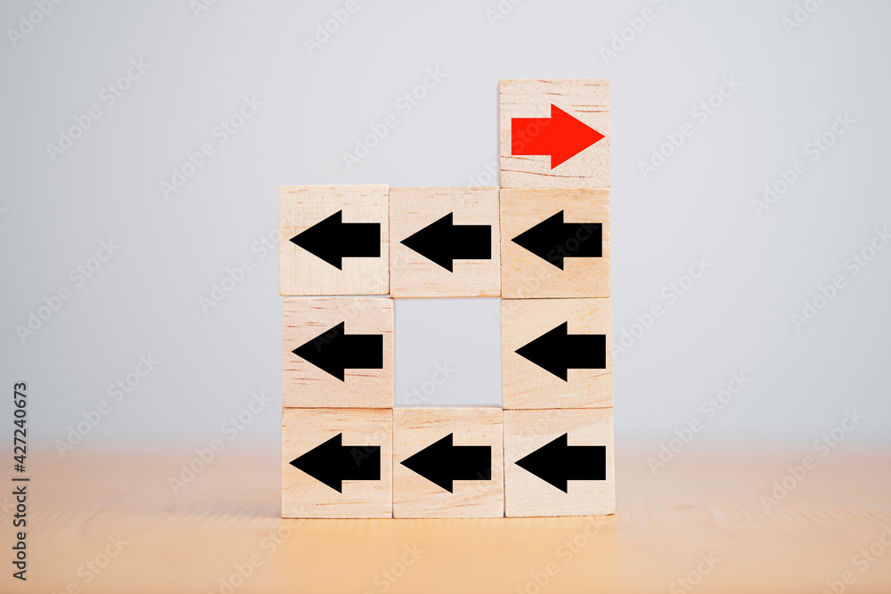 One of red arrow move to opposite direction with others black arrow which print screen on wooden block cubes for business disruption and different thinking idea.