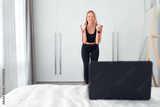 woman doing fitness exercise at home using rubber for fitness