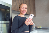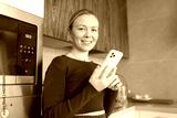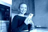 woman in the kitchen with a phone