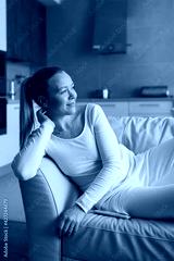 Young woman lay on sofa at home, wear comfortable home suit