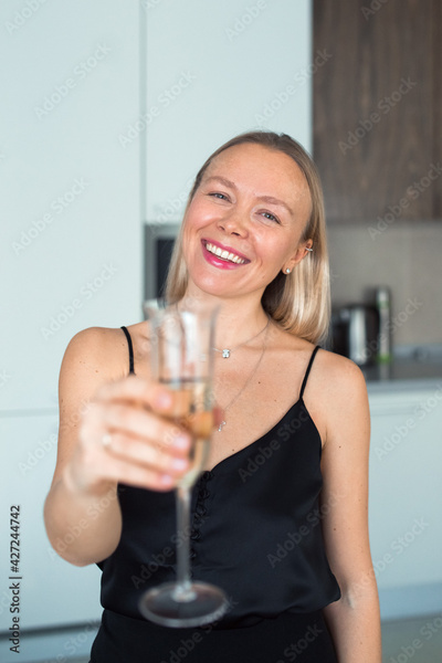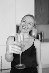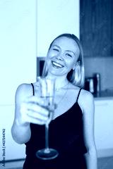 woman sitting at table at home with wine glass, look at camera, smiling face