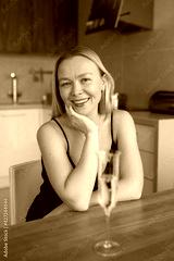 woman sitting at table at home with wine glass, look at camera, smiling face