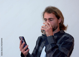 A Spanish young bearded male drinking a glass of water and looking at his smartphone
