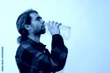 Side view of a Spanish young bearded male drinking water from a bottle on the white background