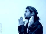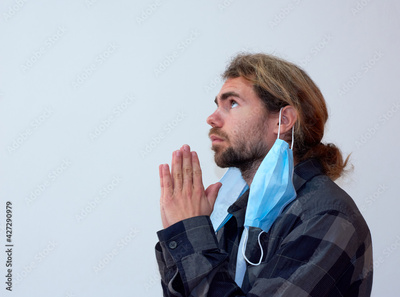 A Spanish young bearded male wearing protective facemasks incorrectly and praying -COVID-19