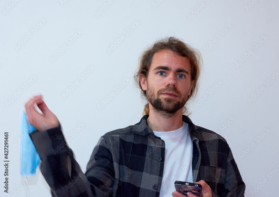 A young Hispanic man holding a blue protective mask in one hand and his phone on the other