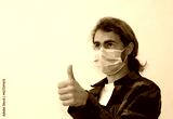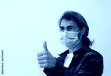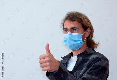 A side view of a Spanish young bearded male wearing a protective facemask and making thumb up sign