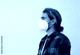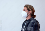 A side view of a spanish man wearing a protective face mask on the white background