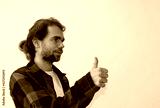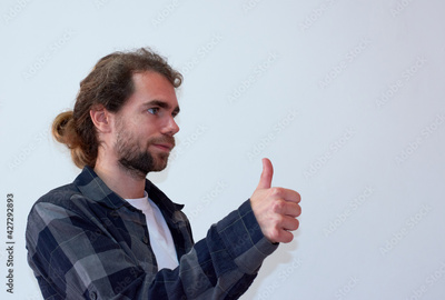 A side view of a Spanish young bearded male giving thumbs up on the white background