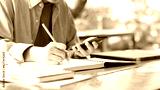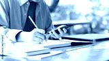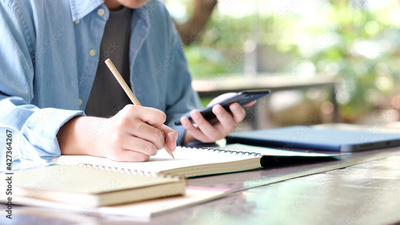 Online study, Student man hand writing on notebook while using mobile phone for digital home study class, Adult male student doing lesson while e learning by smartphone, Education, Work from home