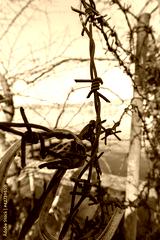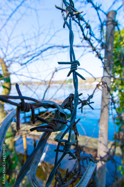 View of the wooden jetty to the lake through barbed wire (Stienitzsee, Brandenburg, germany)