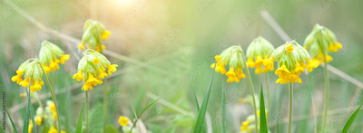 wild primula veris flower close up. first spring yellow blooming primrose flowers (common cowslip), natural green background. spring season. banner