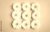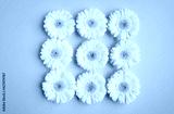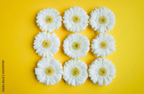 White gerbera daisy flower buds arranged in a square shape on trendy yellow colour background. Creative spring flat lay composition in top view with copy space.