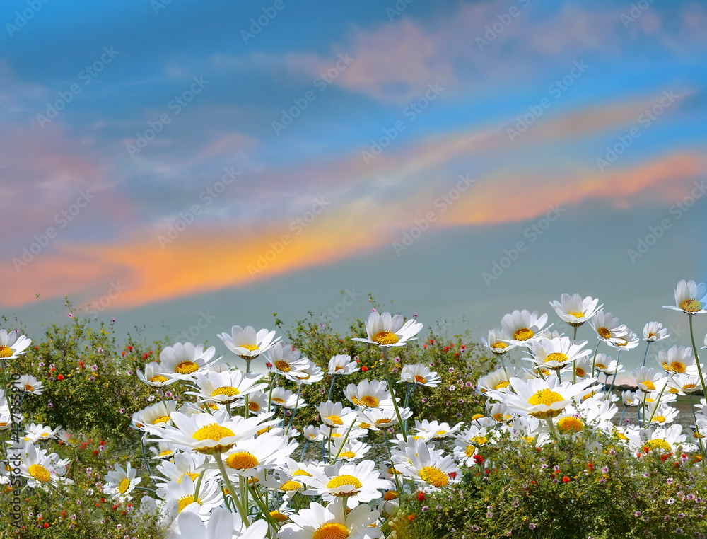blue sky dramatic clouds at gold sunset at sea wild flowers daisy field seascape summer nature landscape sunbeam